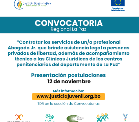 Contratar los servicios de un/a profesional Abogado Jr. que brinde asistencia legal a personas privadas de libertad, además de acompañamiento técnico a las Clínicas Jurídicas de los centros penitenciarios del departamento de La Paz, en el marco de la implementación del Proyecto “JUSTICIA RESTAURATIVA: Promoviendo modelos de servicios de acceso a la justicia de grupos en situación de vulnerabilidad, procesos de reforma del sistema de Justicia y la difusión del enfoque restaurativo en Bolivia desde la sociedad civil”, que cuenta con el financiamiento de la Unión Europea.