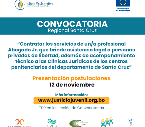 Contratar los servicios de un/a profesional Abogado Jr. que brinde asistencia legal a personas privadas de libertad, además de acompañamiento técnico a las Clínicas Jurídicas de los centros penitenciarios del departamento de Santa Cruz, en el marco de la implementación del Proyecto “JUSTICIA RESTAURATIVA: Promoviendo modelos de servicios de acceso a la justicia de grupos en situación de vulnerabilidad, procesos de reforma del sistema de Justicia y la difusión del enfoque restaurativo en Bolivia desde la sociedad civil”, que cuenta con el financiamiento de la Unión Europea.
